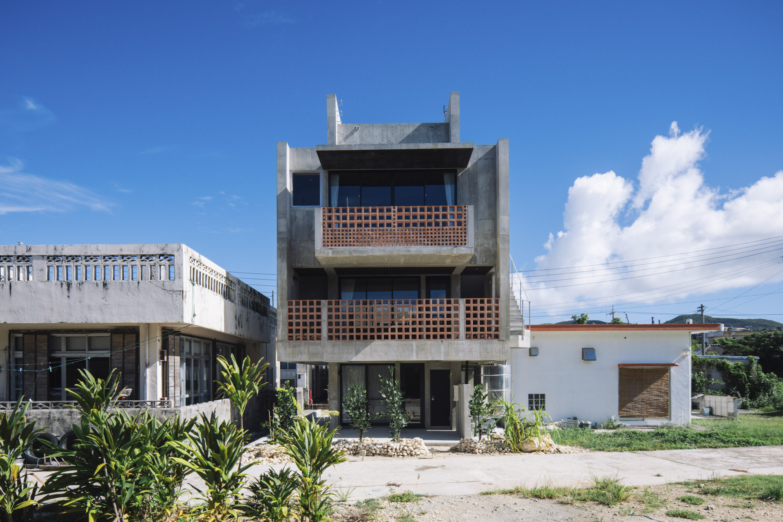 テラスには、赤瓦の材料でつくられたマスブロックが沖縄らしさを演出している。