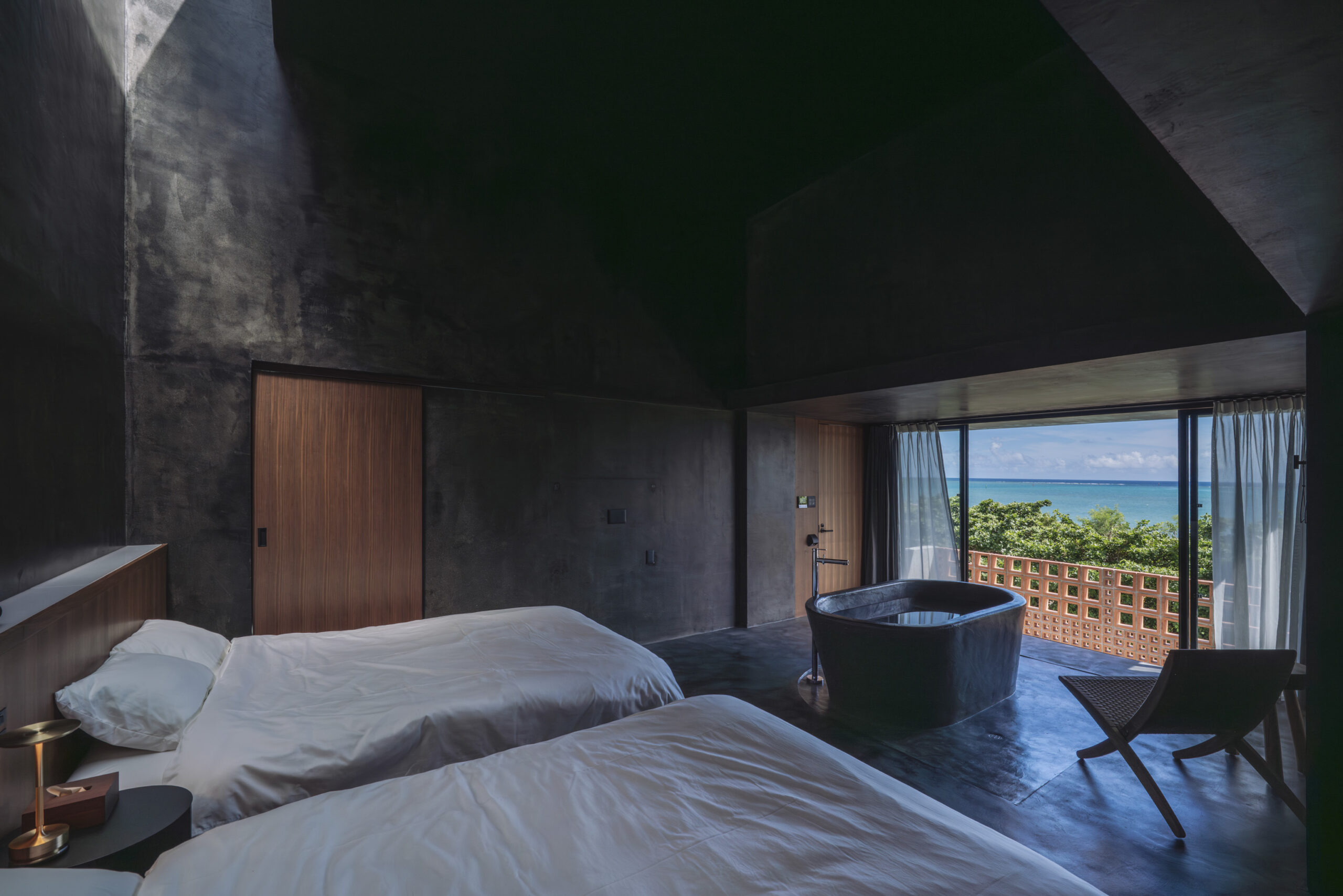 3階は中央に浴槽を大胆に配置し、久米島の美しい海と空を味わいながら過ごせる、非日常空間を演出した。 室内は沖縄のガマ(洞窟)をイメージして全体的に暗くし、テラス・浴室・ベッドスペースと天井と床の高さを変えながら、トップライトからの光へと繋がっていく。 その光が、時間の移ろいを知らせてくれる。