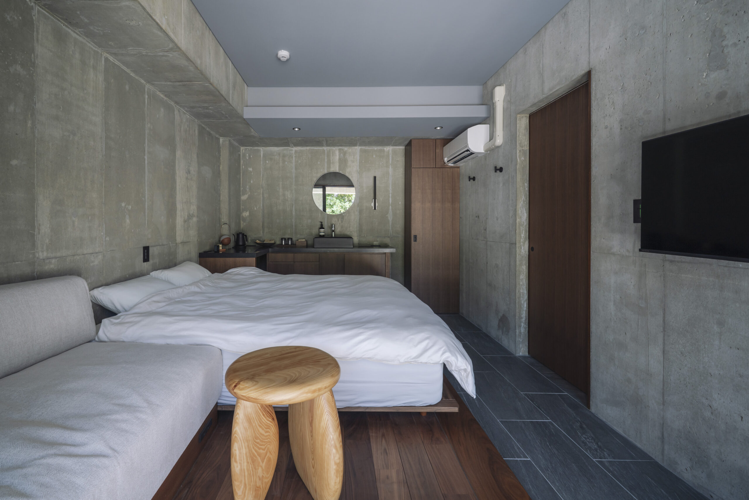 また、部屋のトーンを抑える事で、窓の向こうに広がる海の景色を際立つよう意識した。