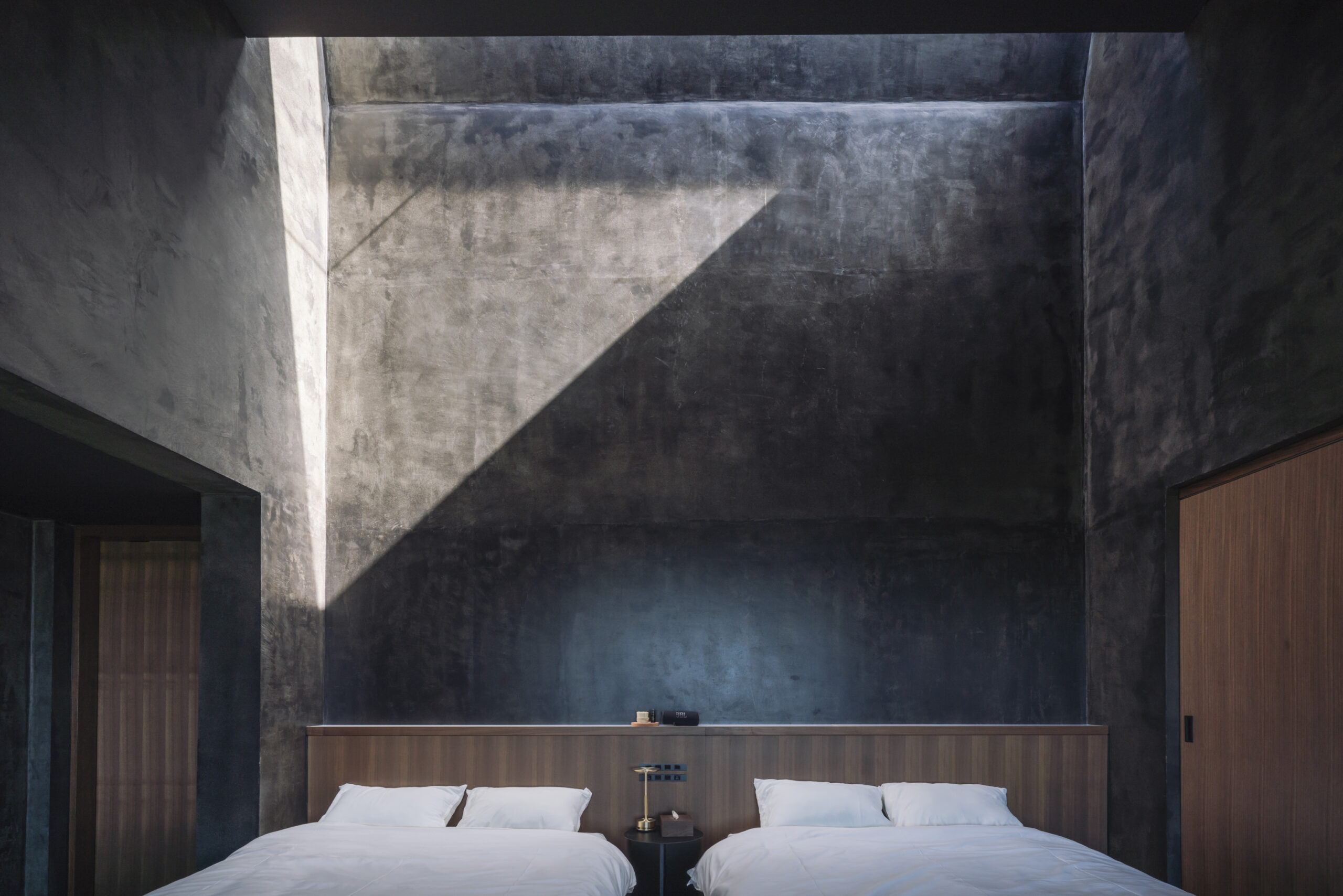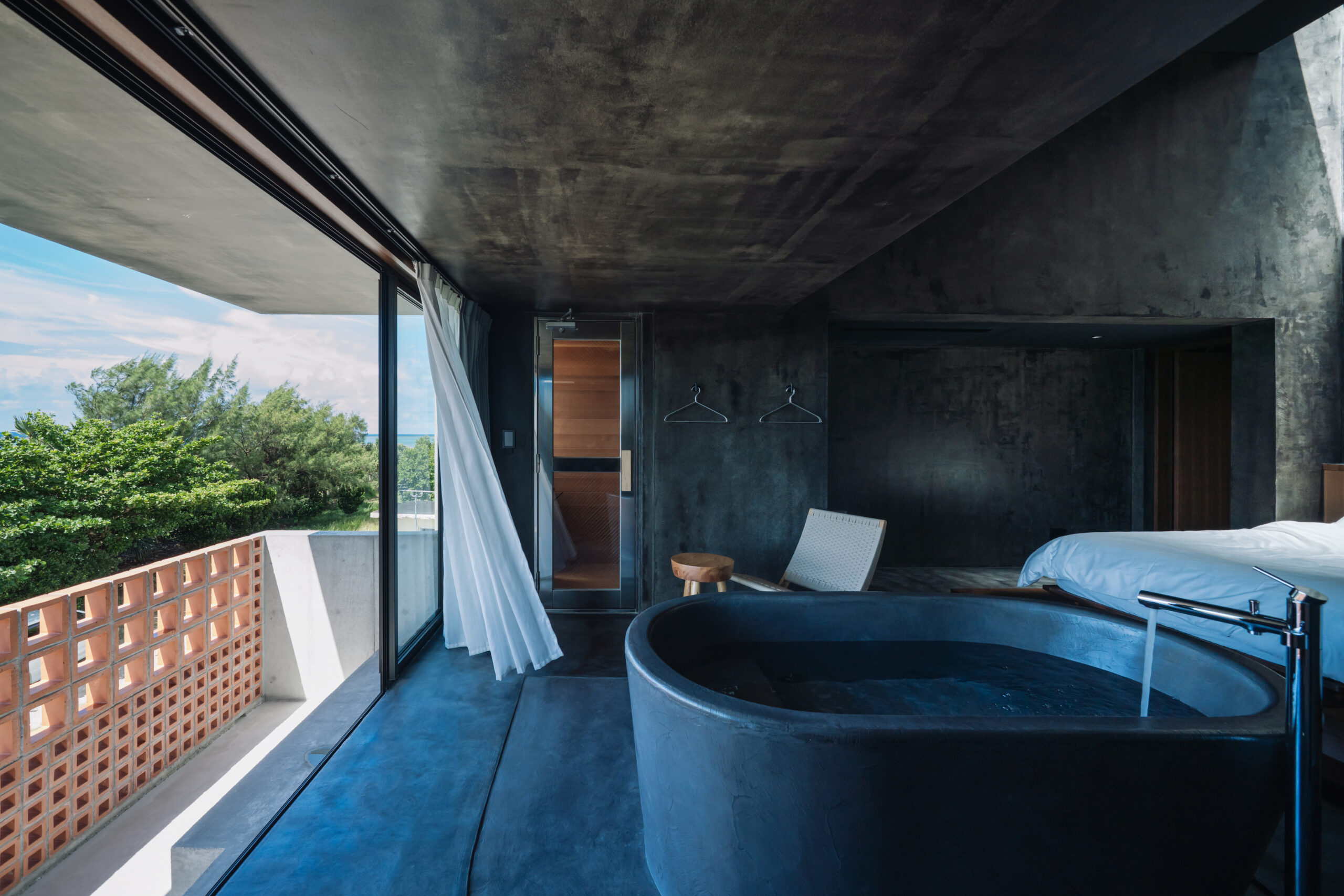 3階は中央に浴槽を大胆に配置し、久米島の美しい海と空を味わいながら過ごせる、非日常空間を演出した。 室内は沖縄のガマ(洞窟)をイメージして全体的に暗くし、テラス・浴室・ベッドスペースと天井と床の高さを変えながら、トップライトからの光へと繋がっていく。 その光が、時間の移ろいを知らせてくれる。