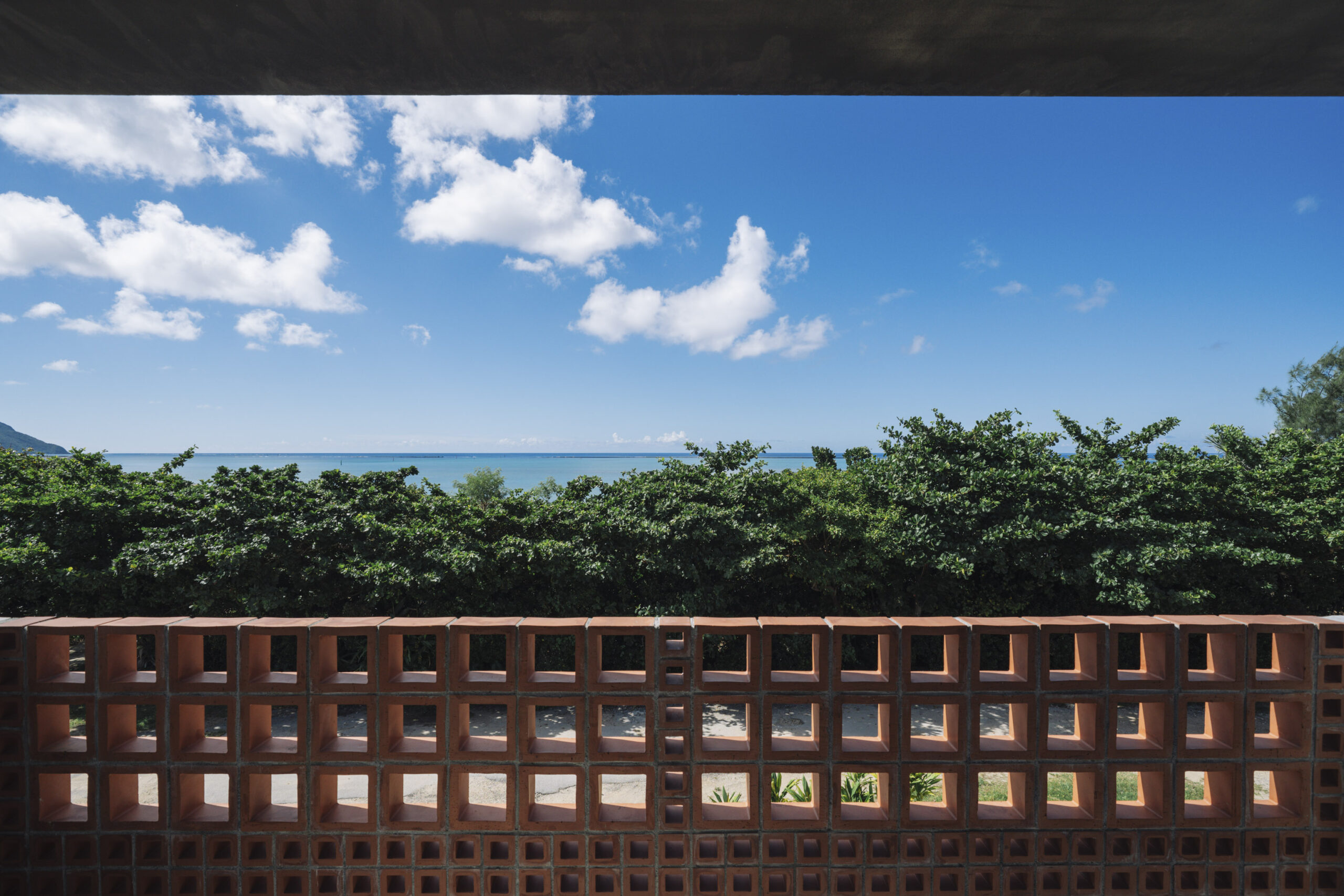 テラスには、赤瓦の材料でつくられたマスブロックが沖縄らしさを演出している。